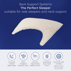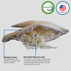 Materiales 100% orgánicos en su interior. El látex natural triturado crea una estructura transpirable, absorbe la humedad e inhibe el crecimiento de moho o hongos. El látex natural, altamente resistente y duradero no se descompone. La cremallera ajustable en el lateral permite ajustar los materiales para dormir de lado, boca arriba o boca abajo con soporte para el brazo. ¡Garantía de 5 años, resistente a los ácaros del polvo y nunca necesita esponjarse!