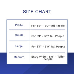 La talla grande se adapta a 5'7" y hasta aproximadamente 6'4". Si mides más de 6'4”, tenemos algunas soluciones. Detalles del sistema: Hecho de bioespuma ambientalmente segura, patentado y fabricado en los EE. UU., cubiertas de bambú hipoalergénicas , lavables, removibles y con certificación pura, y potencialmente facturables por el seguro.
