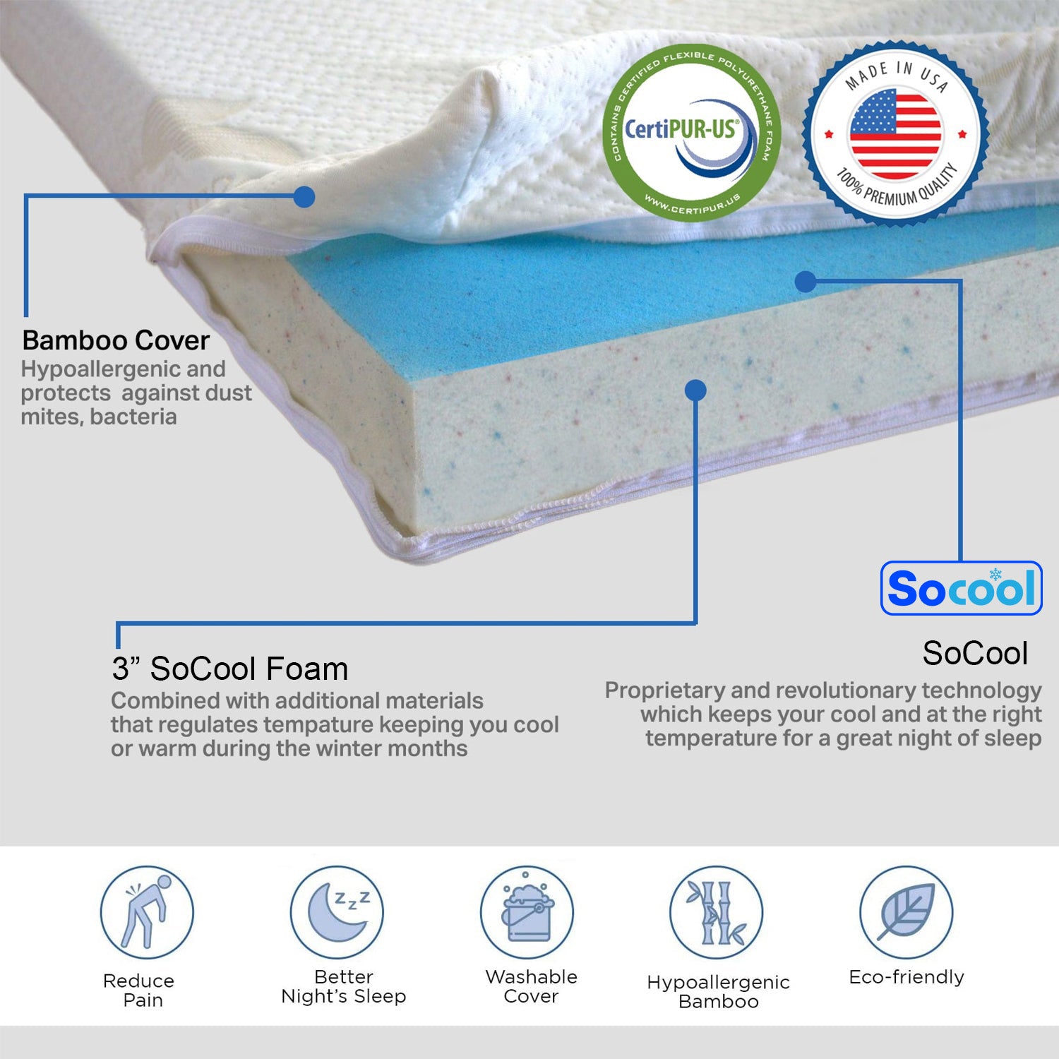 El protector de espuma BCool de Back Support Systems tiene capas para brindar comodidad y presión mientras interactúa con la temperatura de su cuerpo para compensar y mantener la temperatura de su cuerpo en niveles óptimos para dormir.